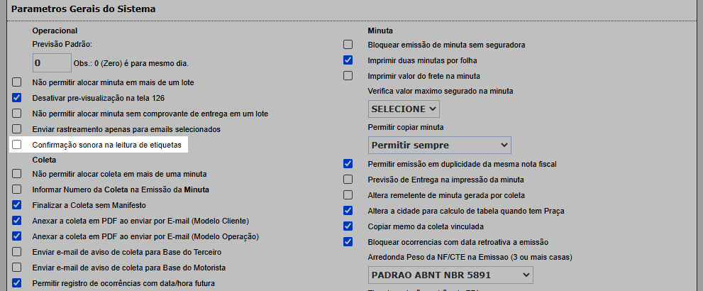 Ao clicar neste opção o sistema irá habilitar o sinal sonoro ao efetuar a leitura das minuta nas seguintes telas: