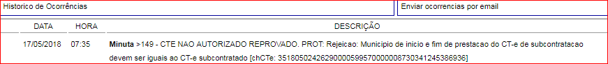 - Rejeição 832 : Município de início e fim de prestação do CT-e de subcontratação devem ser iguais ao CT-e subcontratado.