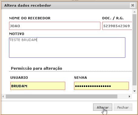- Ainda nesta tela, contamos com a opção “Altera dados recebedor”(2), onde você pode alterar os dados do recebedor. Se alterar, lembre-se de preencher o campo “Motivo”:
