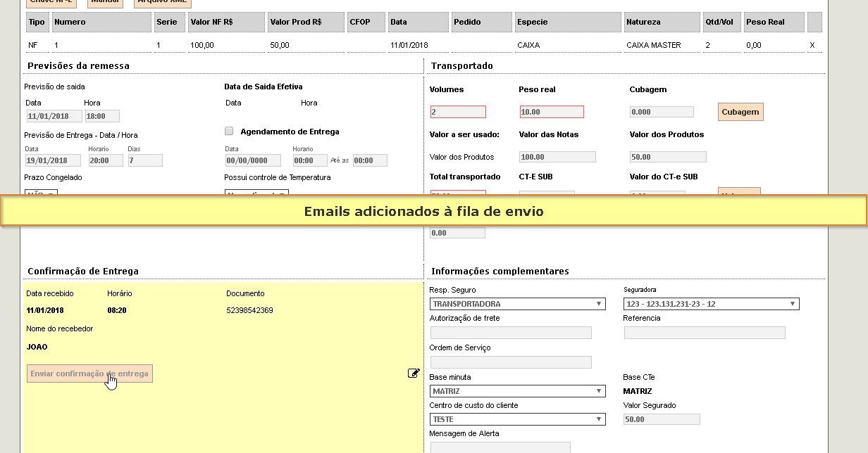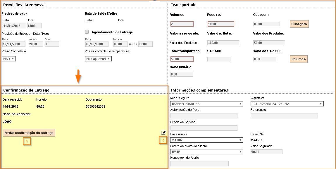 - Neste item, está disponível o novo botão “Enviar confirmação de entrega” (1). Ao clicar nesse botão serão enviados novamente e-mails confirmando a entrega: