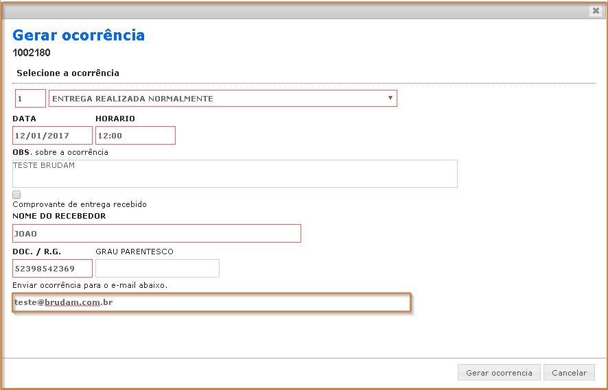 - Você deve preencher os campos obrigatórios da tela “Gerar ocorrência”, e adicionar também o e-mail para receber o alerta de reenvio: