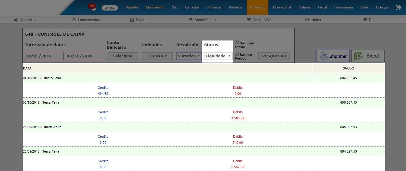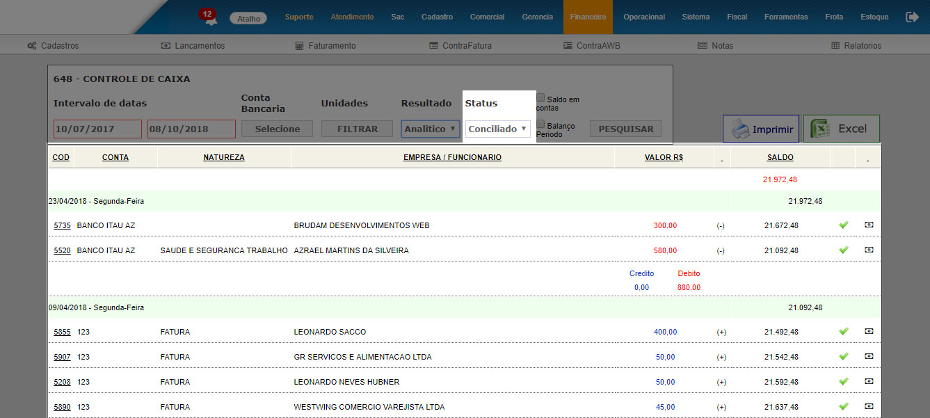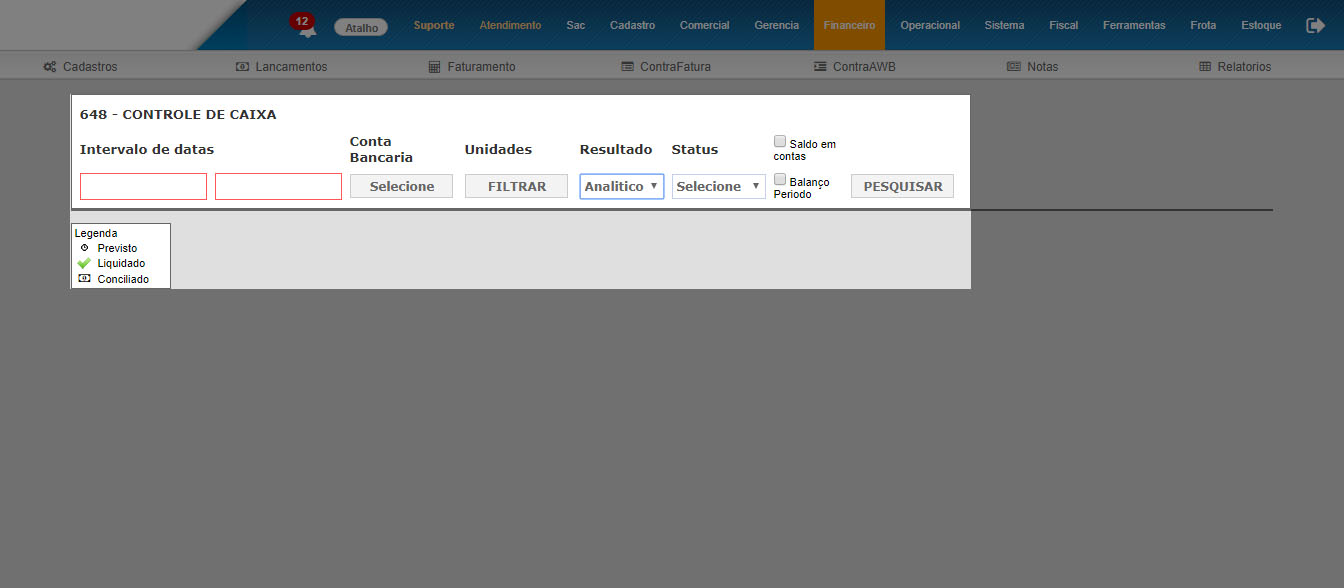 Não existia o relatório de controle de caixa, apenas o fluxo de caixa sem a possibilidade de filtrar por PREVISTO, LIQUIDADO, CONCILIADO.