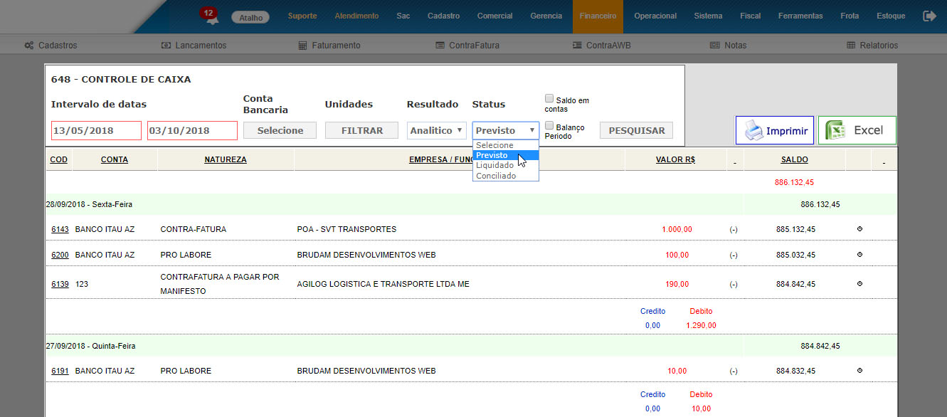 O TMS Brudam já contava com a funcionalidade de fluxo de caixa, além de todo controle do fluxo de caixa agora você conta com a possibilidade de pesquisar lançamentos por status.