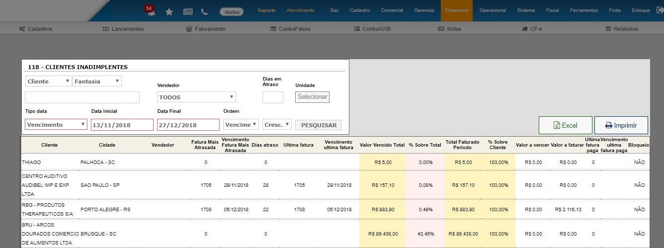 Sabendo da importância deste conjunto de informações, o TMS BRUDAM conta com vários relatórios, entre eles, o relatório de cliente inadimplentes.