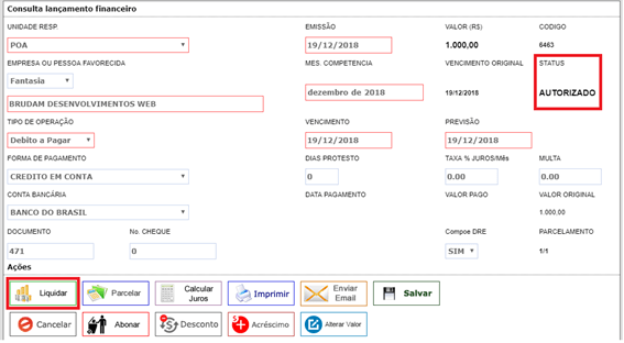 Ao clicar em “OK”, o sistema irá alterar o status do lançamento para “AUTORIZADO“, liberando o botão de “LIQUIDAR“: