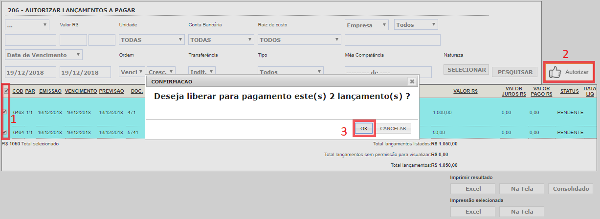 Ao clicar em OK, o status dos lançamentos serão alterados para “AUTORIZADOS“: