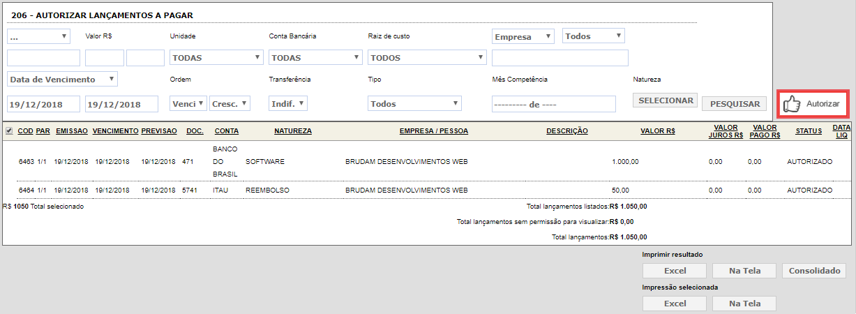 Definindo um período e localizando os lançamentos desejados para autorizar, basta selecioná-los e clicar no botão AUTORIZAR.